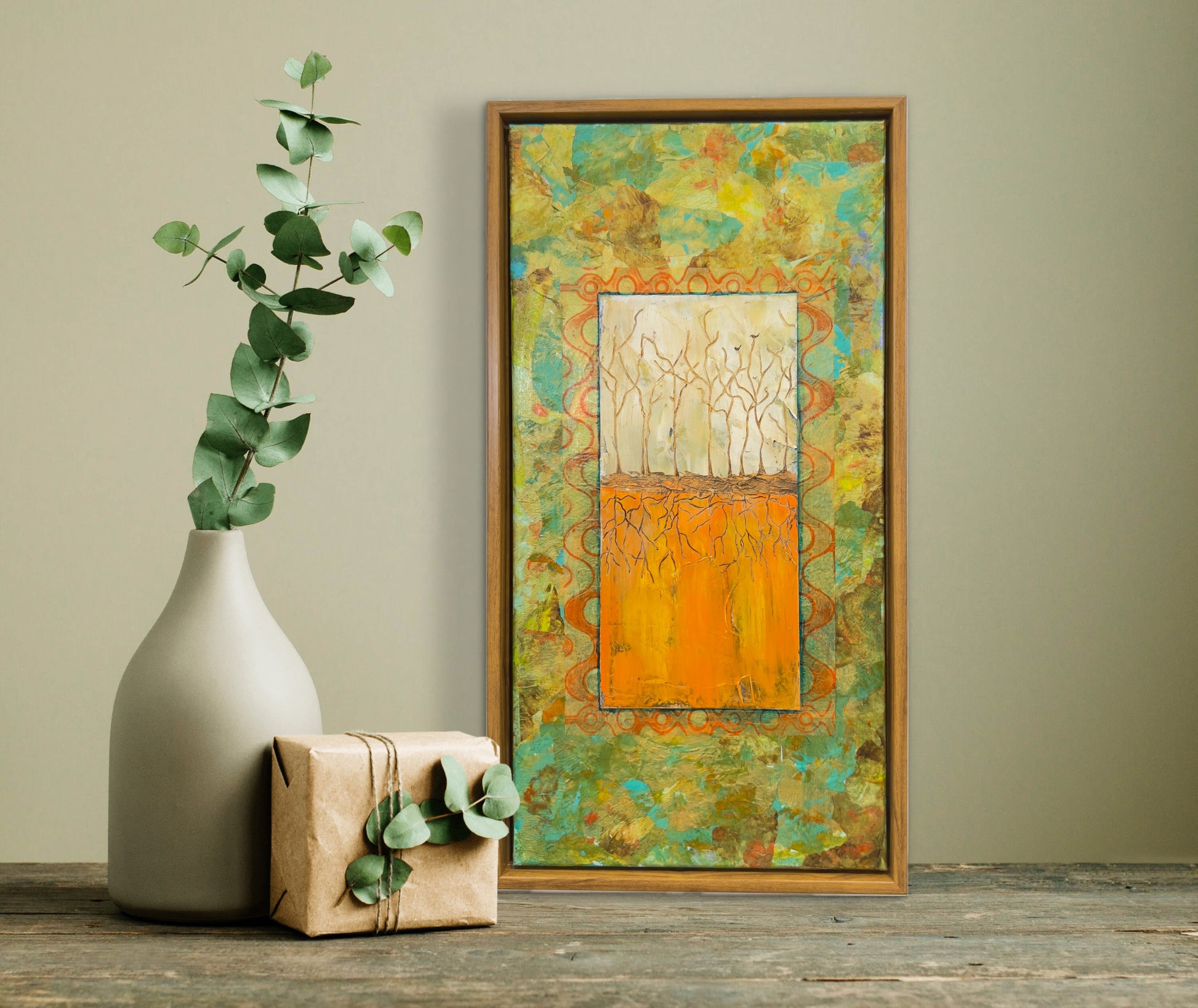 "And the Trees Will Survive" is a thoughtful depiction of the hidden strength beneath nature's canopy, illustrating the intricate roots that support towering trees and the birds that inhabit their branches. This painting invites reflection on resilience and interconnectedness, capturing the quiet power that sustains life above and below ground with graceful, sophisticated artistry.