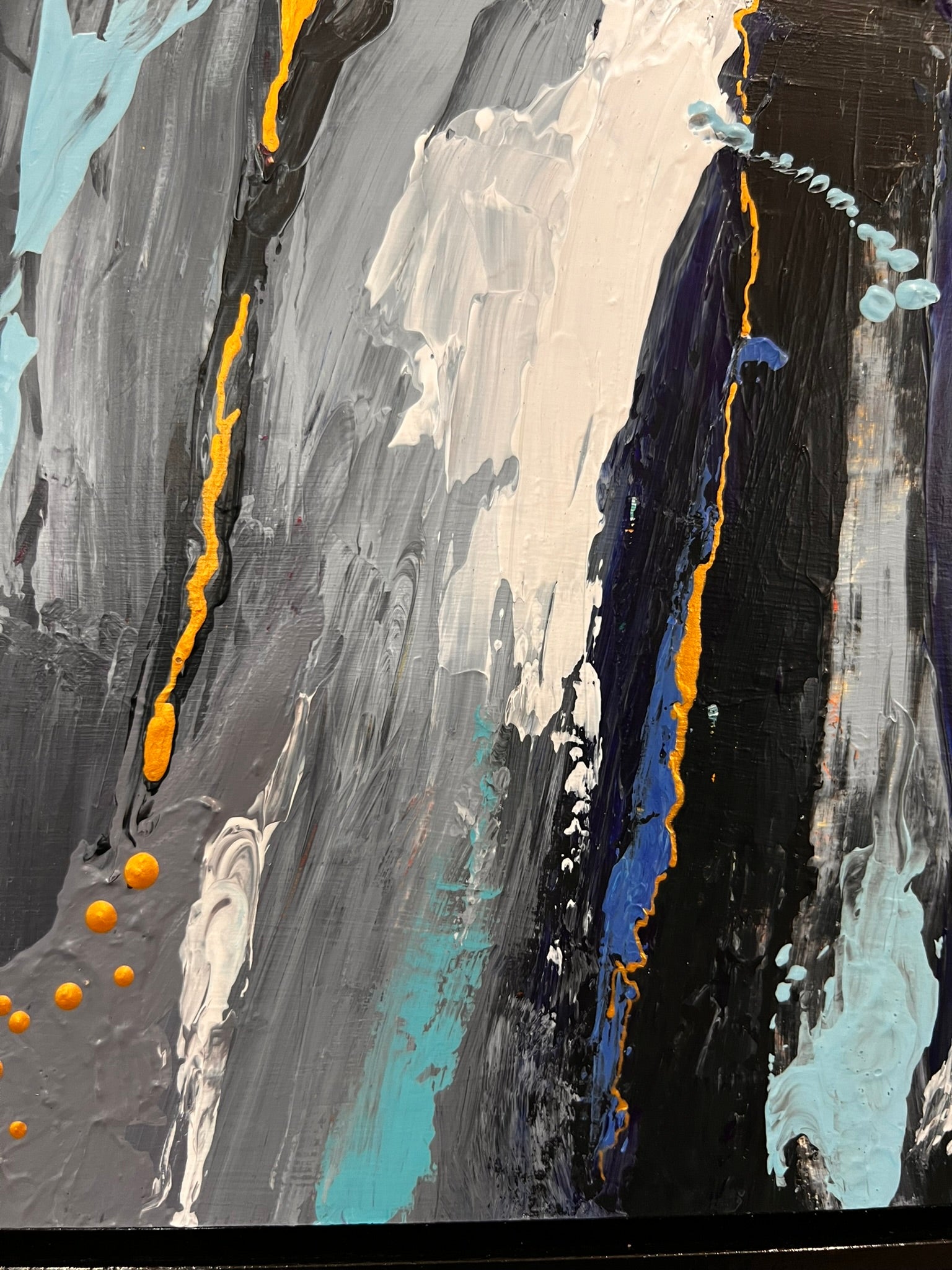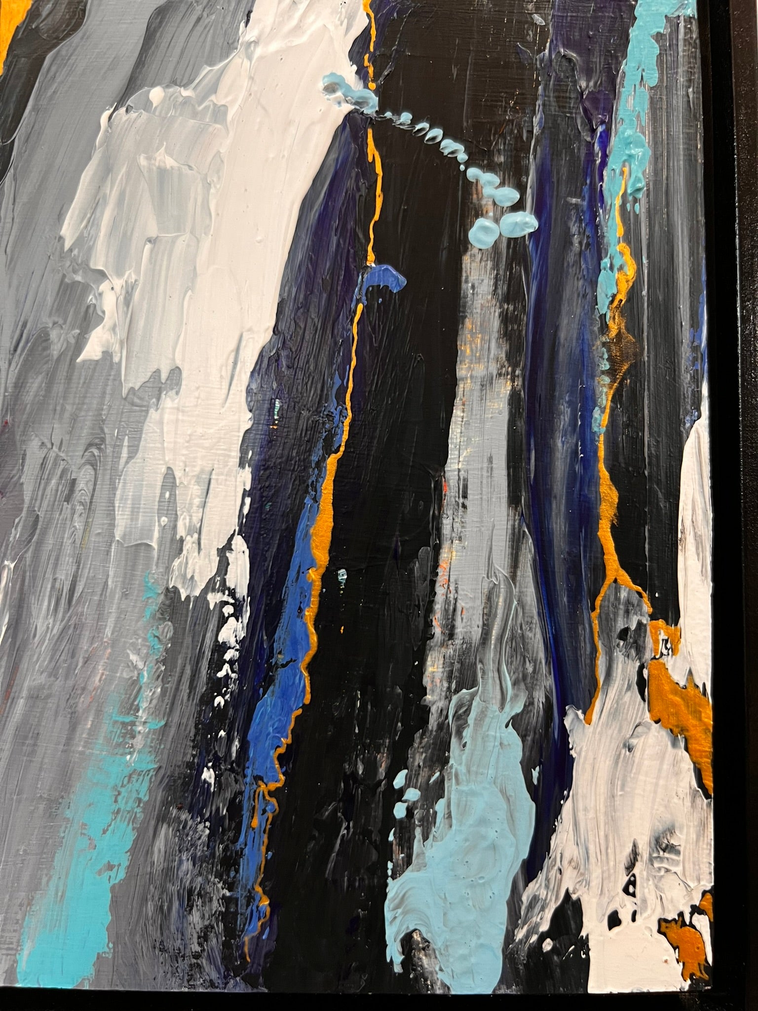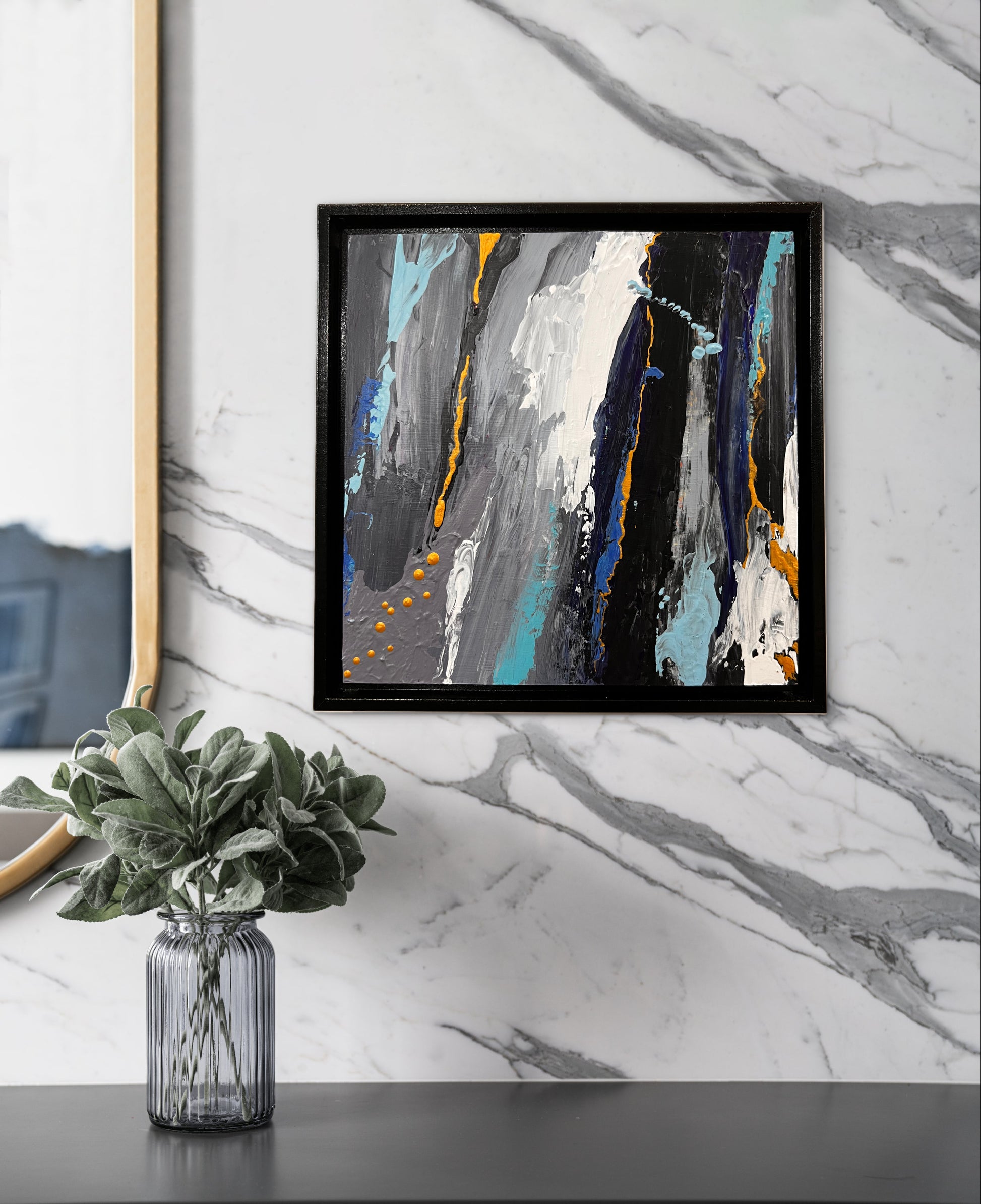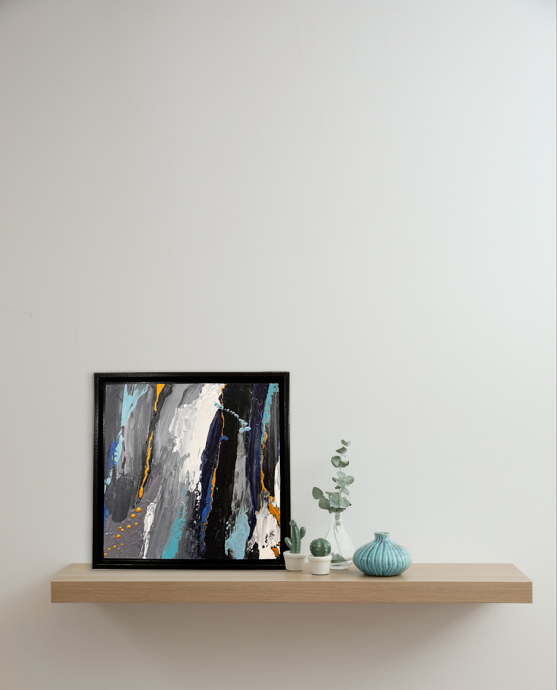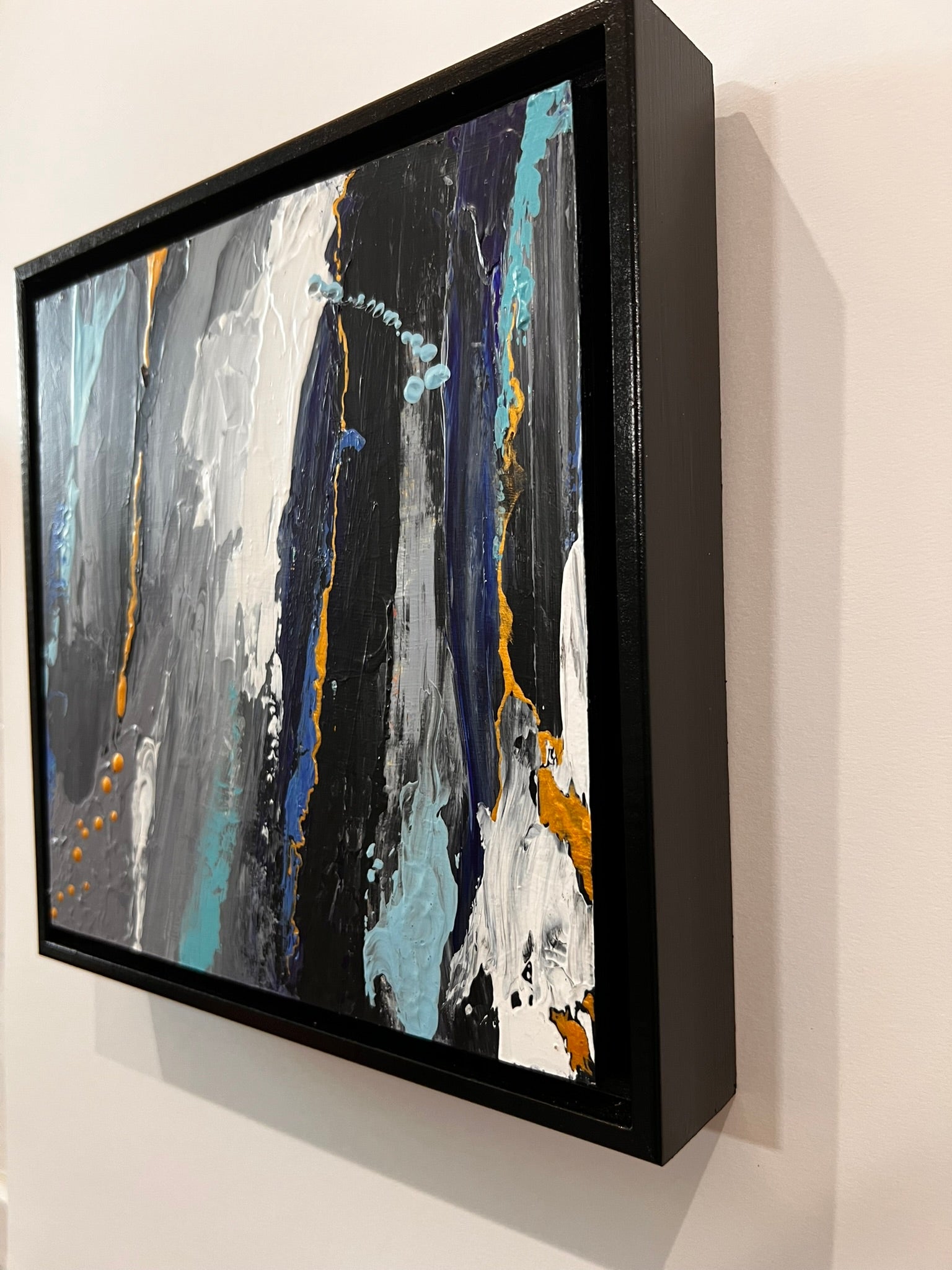 Acrylic on cradled wood canvas, 8"x8", installed in wood black floater frame, measuring 9"x9".