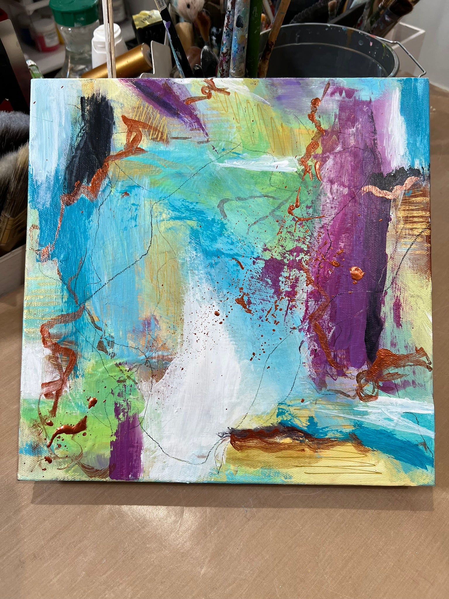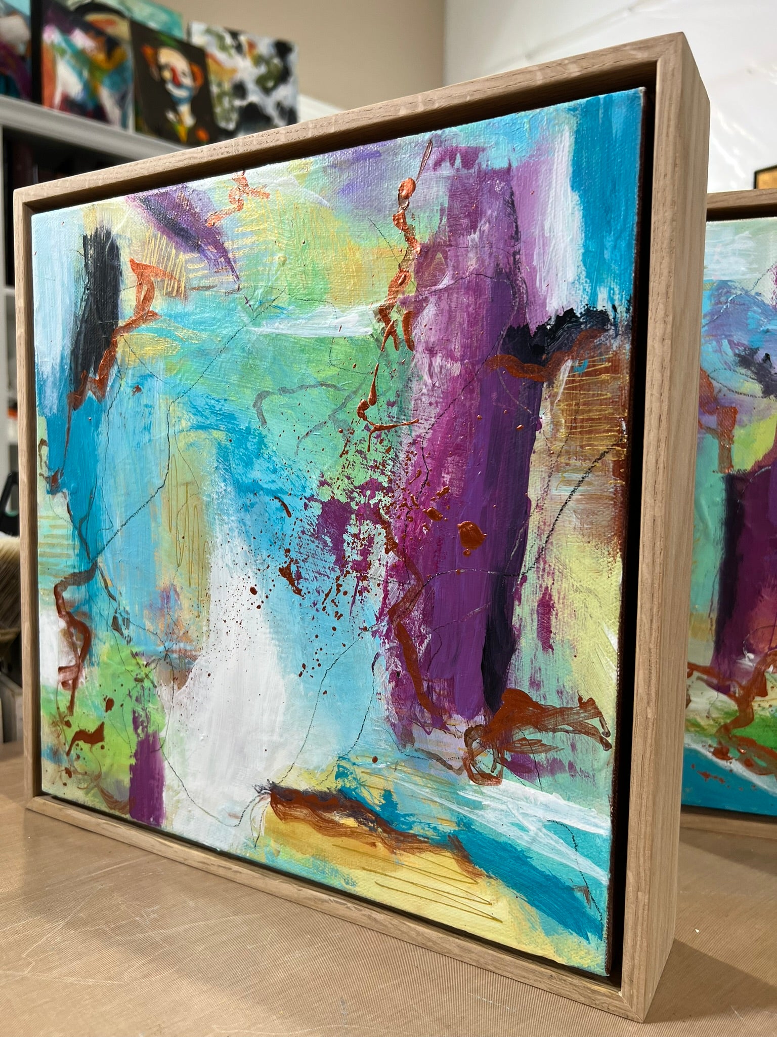 Framed 13"x13"x2.5" Acrylic on gallery canvas. Frames are white oak hardwood, and ready to hang.