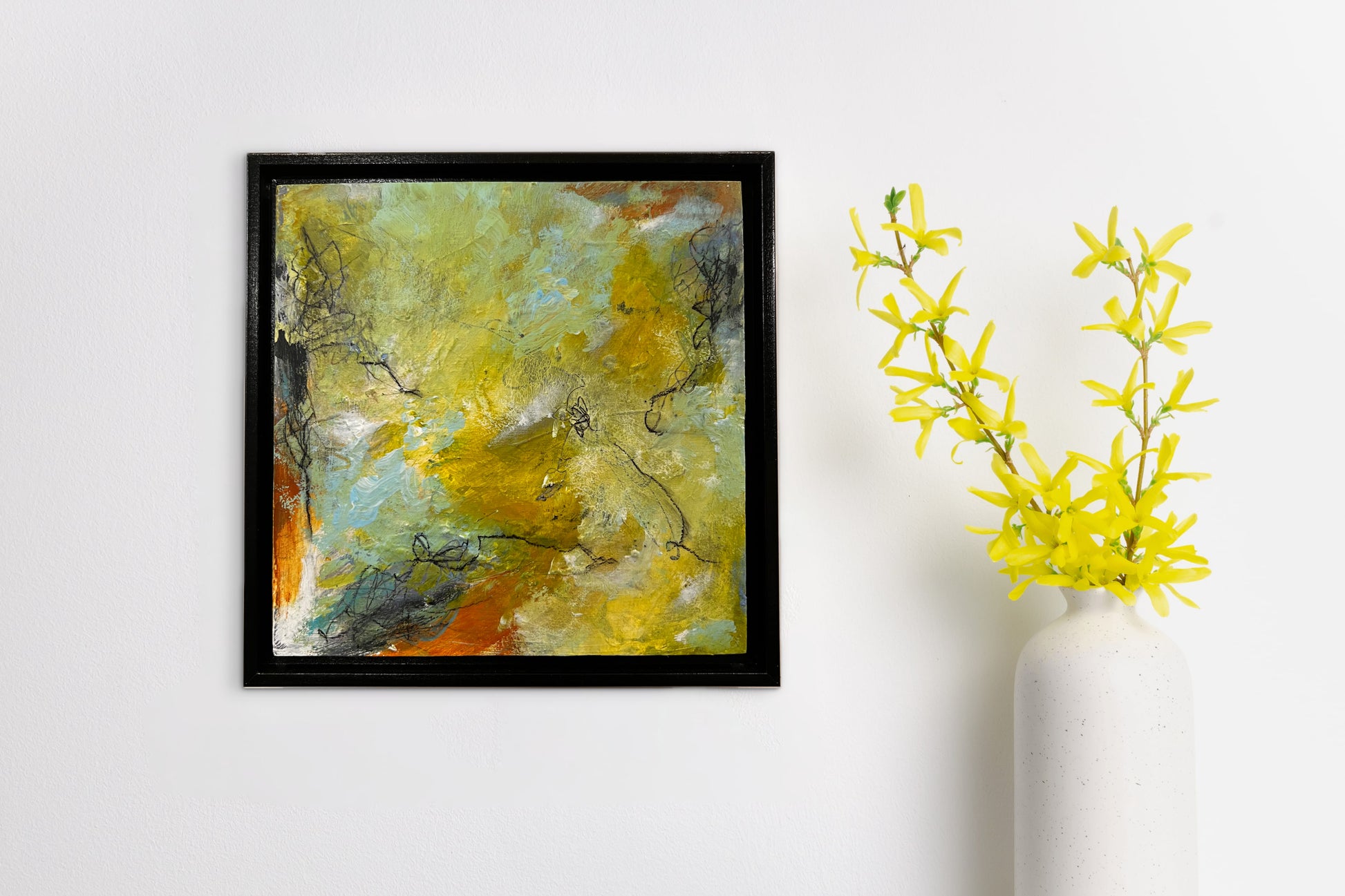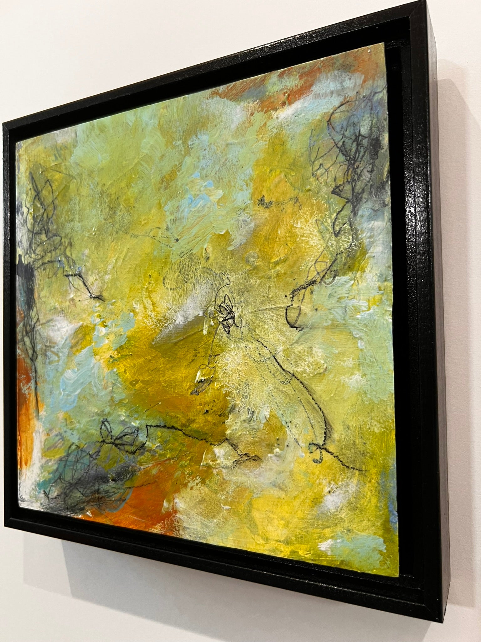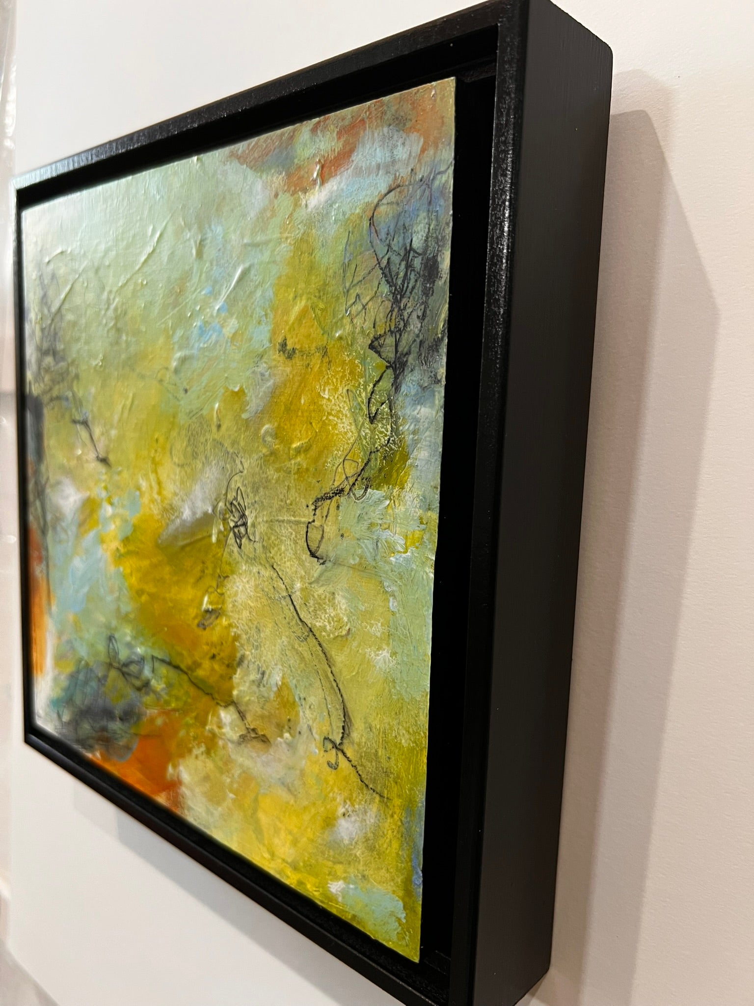 Acrylic on cradled wood canvas, 8"x8", installed in wood black floater frame, measuring 9"x9".