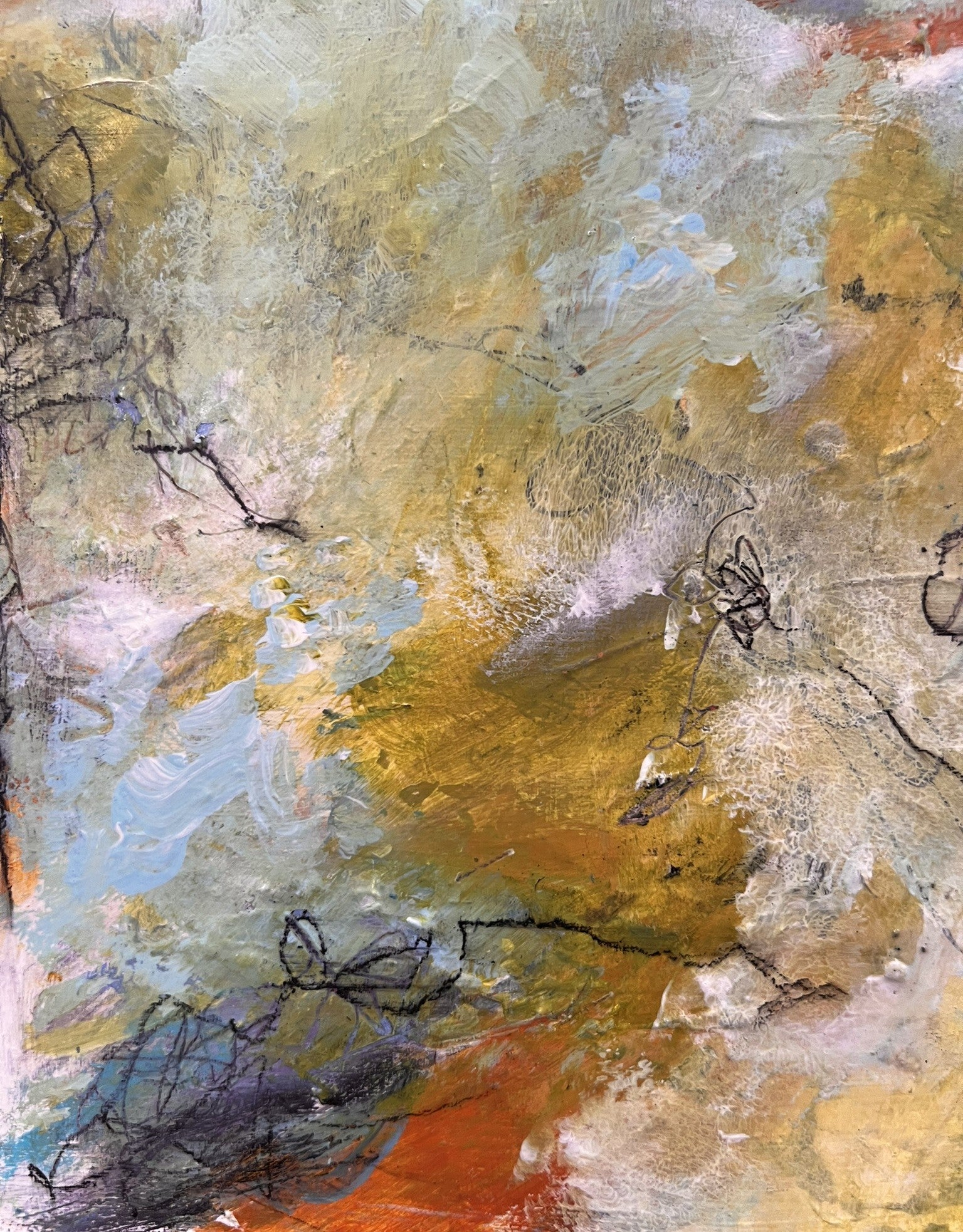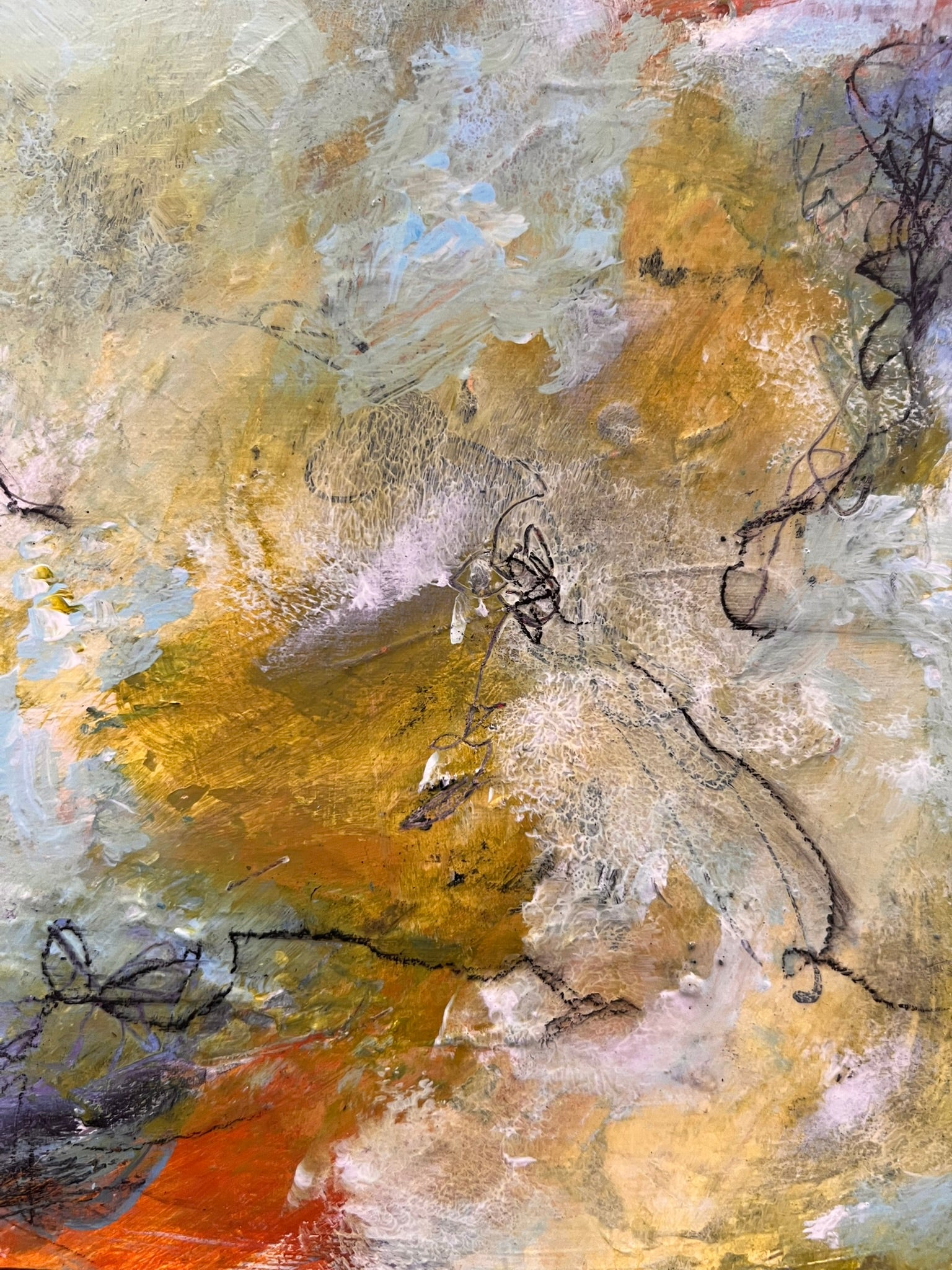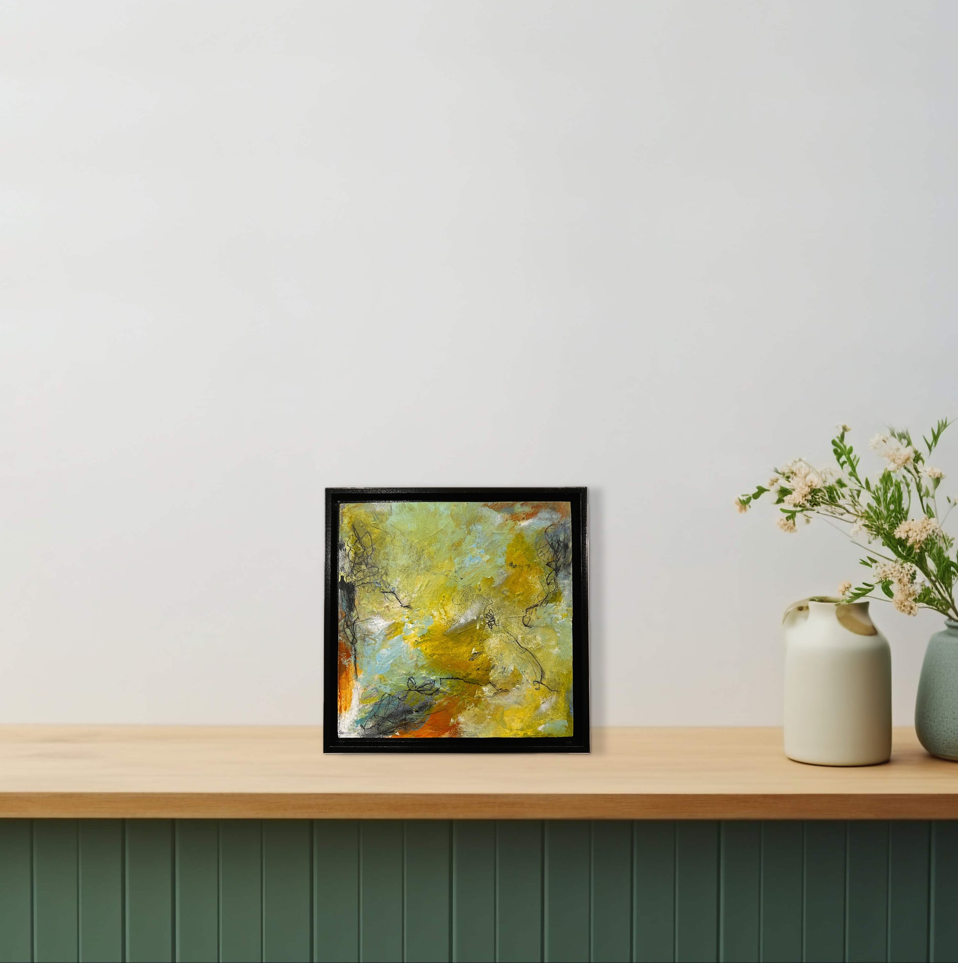 Acrylic on cradled wood canvas, 8"x8", installed in wood black floater frame, measuring 9"x9".