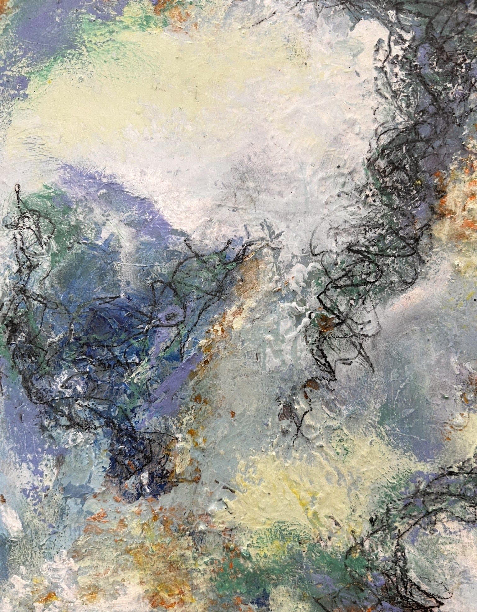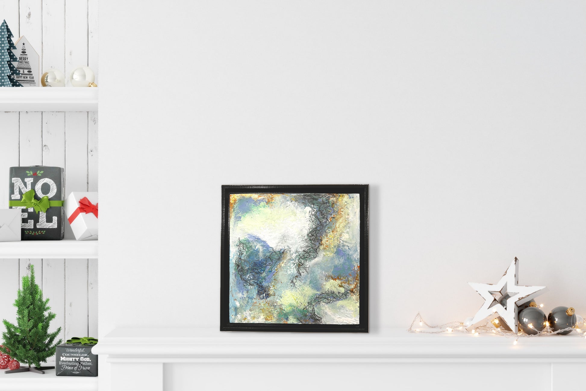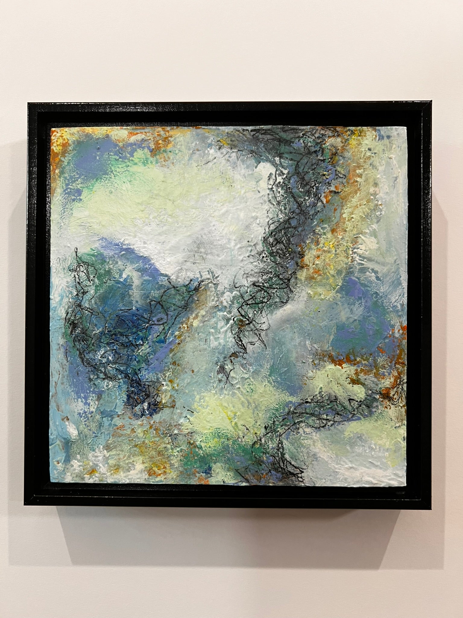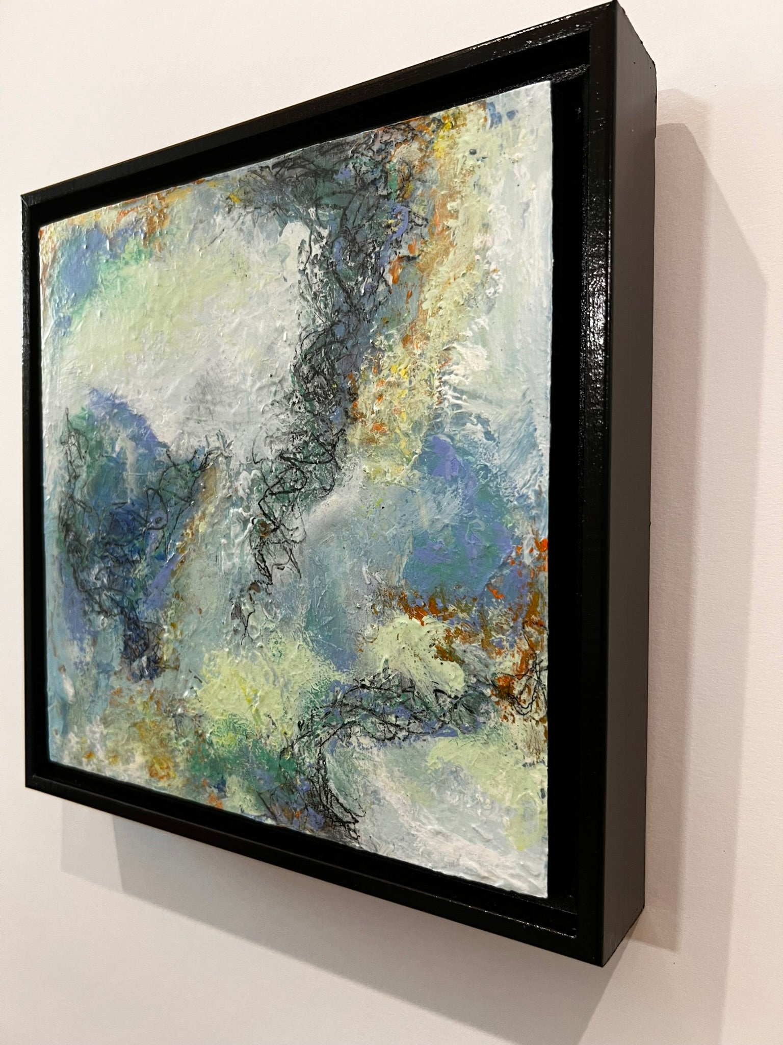 Acrylic on cradled wood canvas, 8"x8", installed in wood black floater frame, measuring 9"x9".
