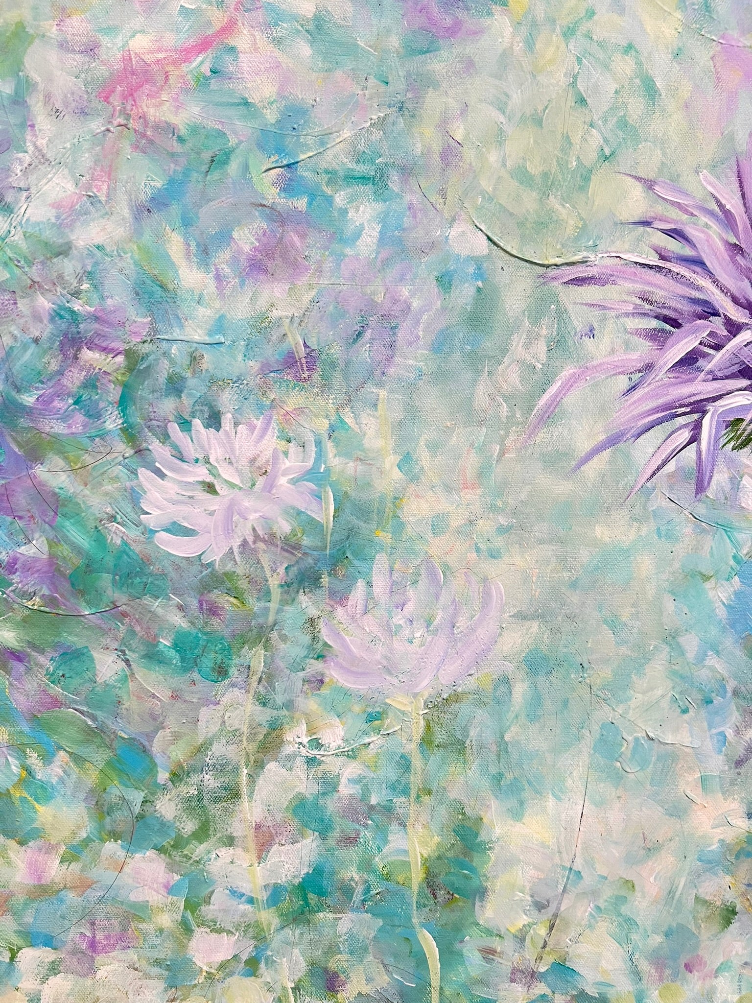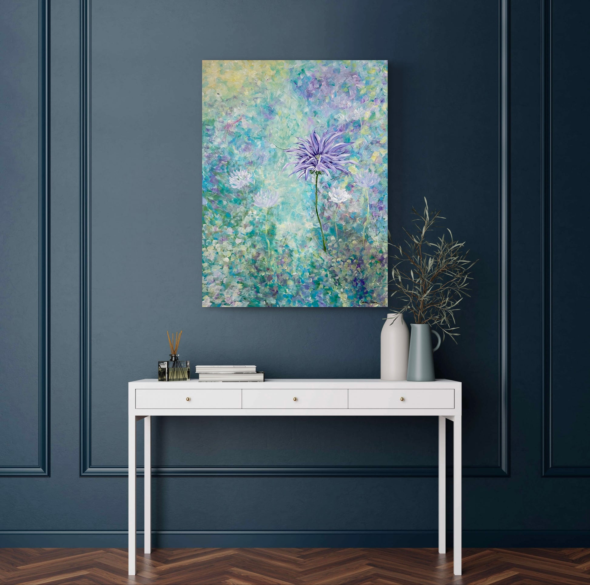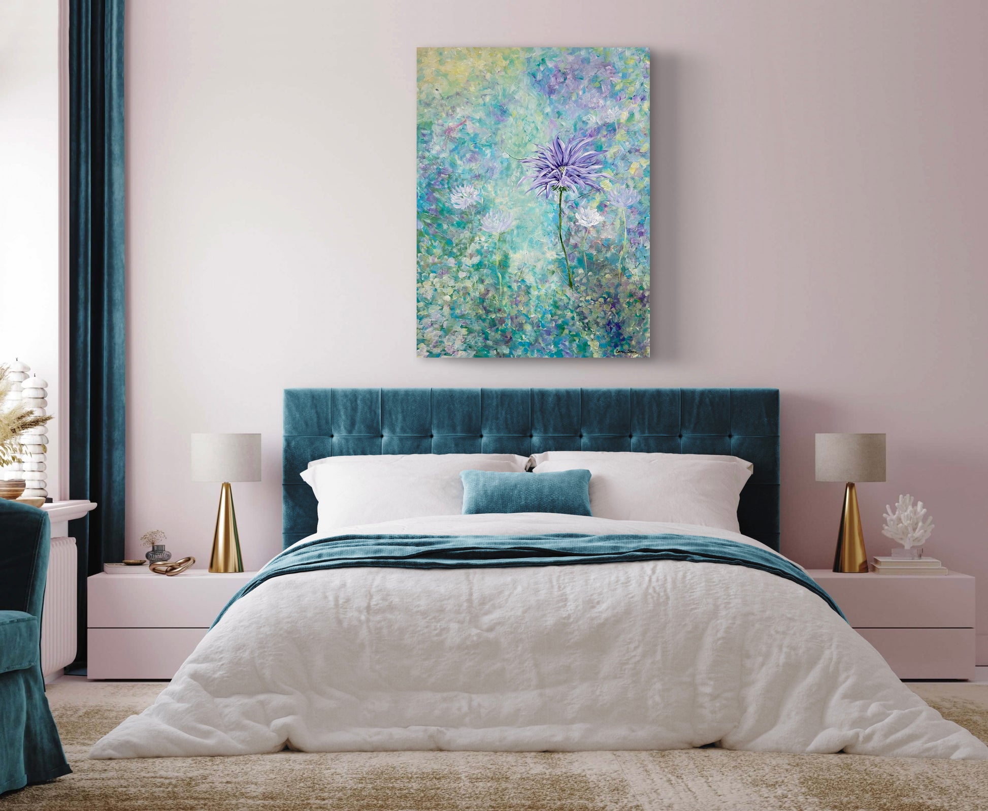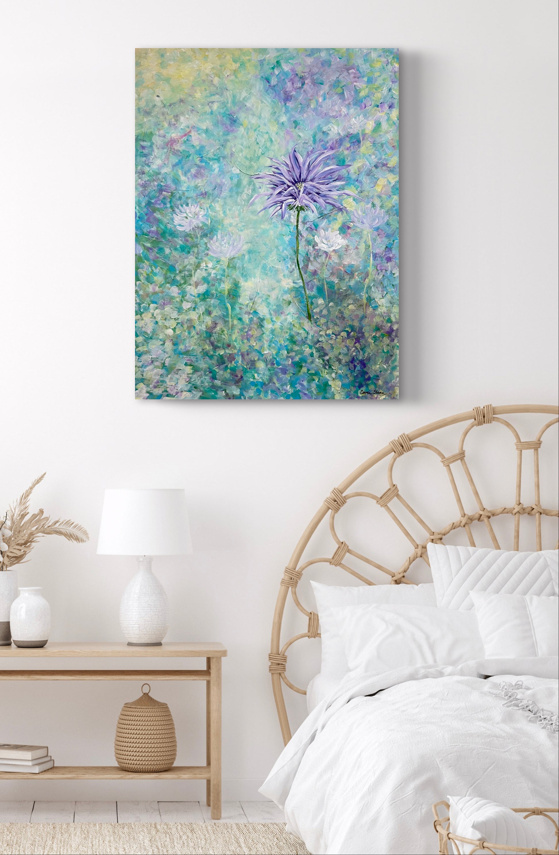 This sophisticated abstract floral artwork in soft lavender and white evokes the enchanting atmosphere of a secret garden. Its delicate composition brings a serene and elegant touch to your space, perfect for creating a peaceful and refined ambiance.