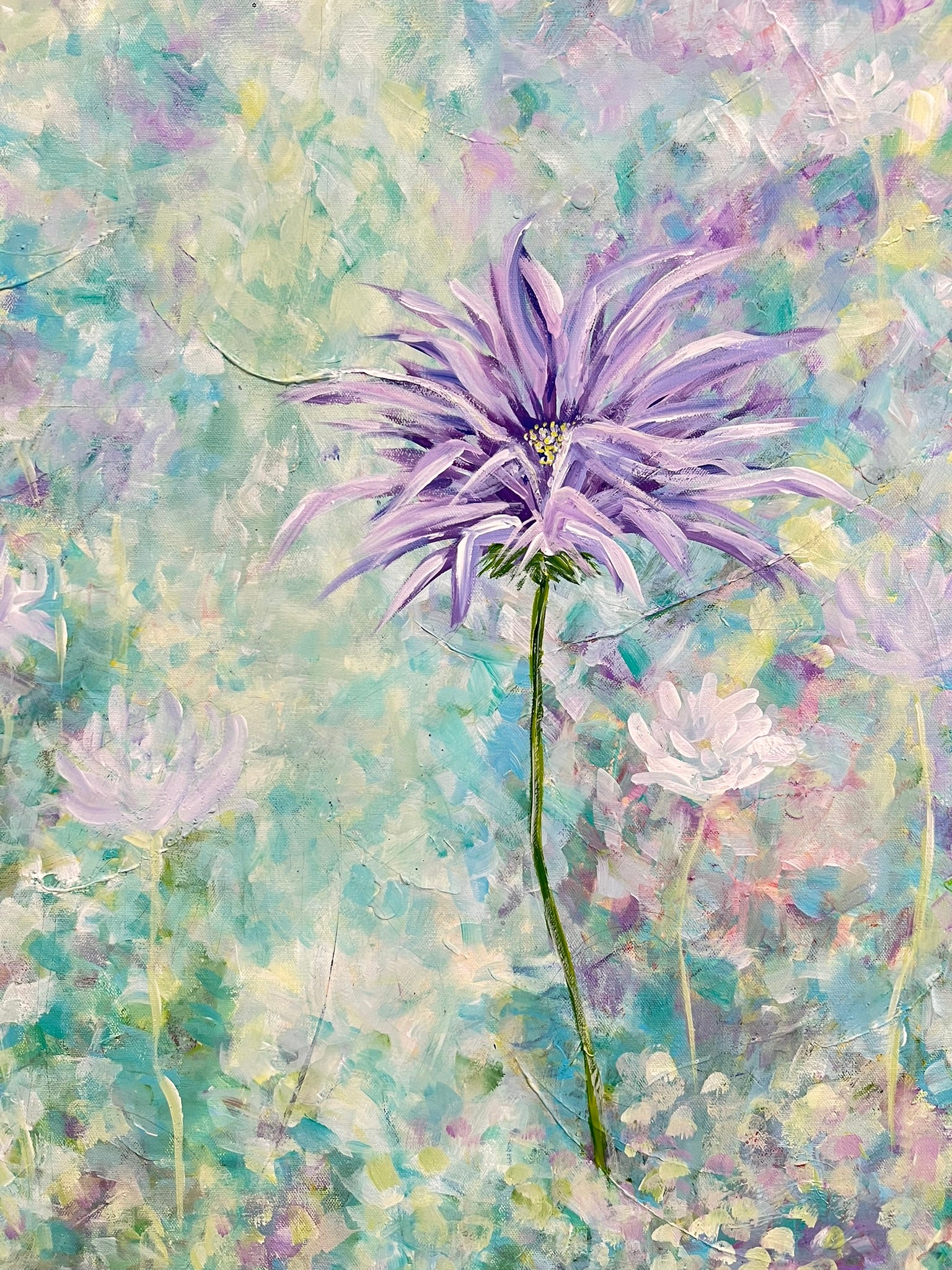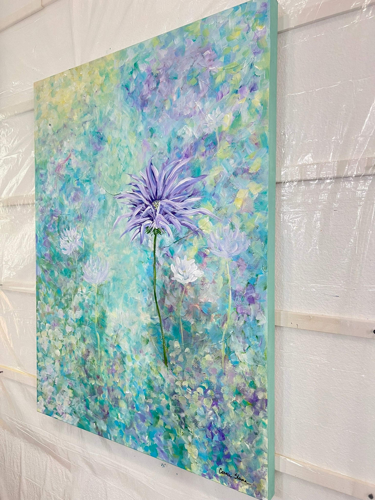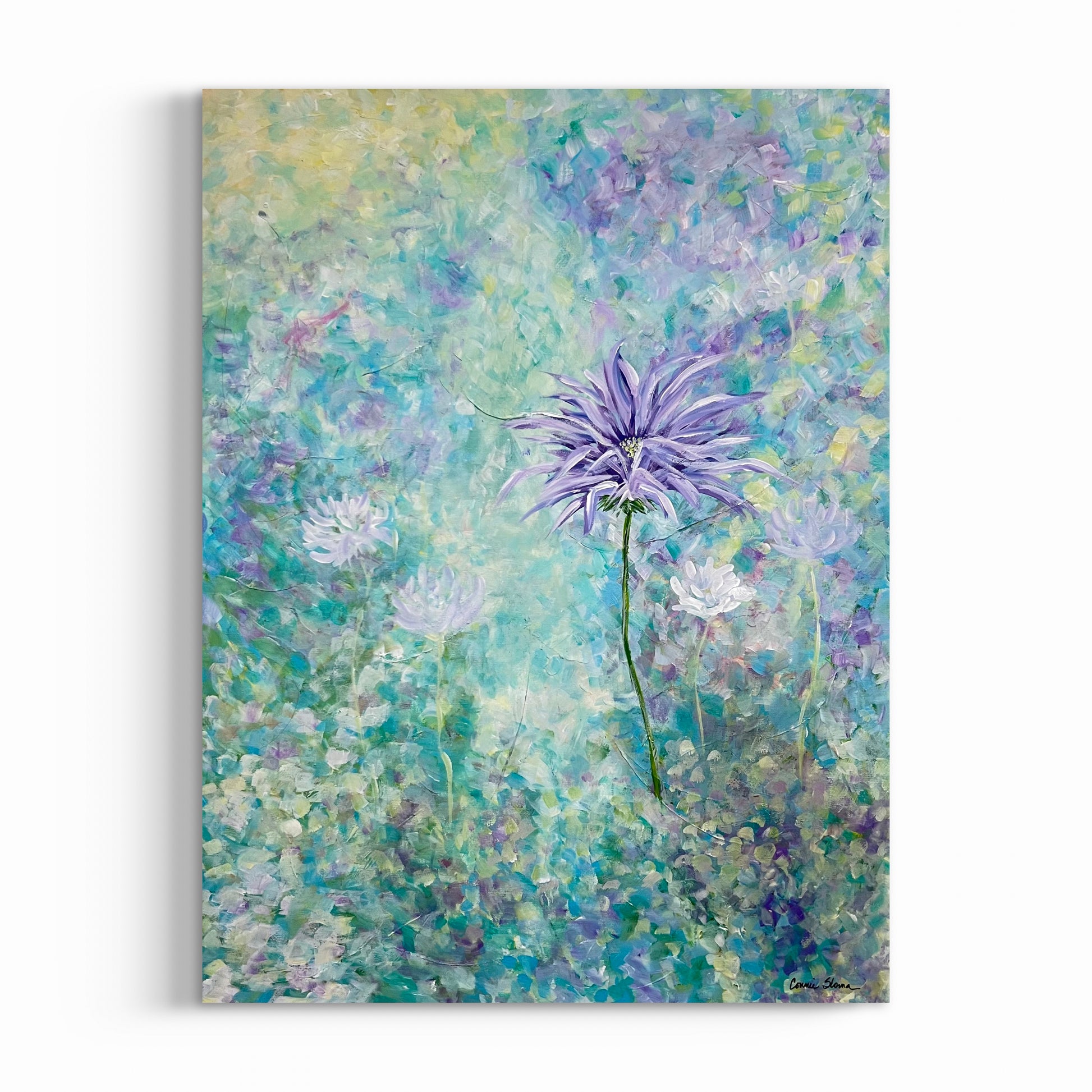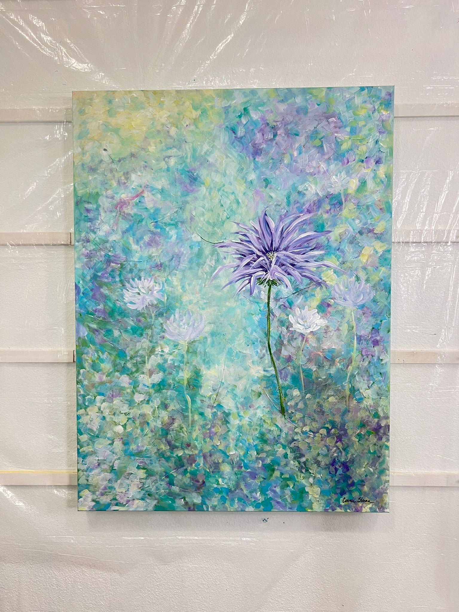 This sophisticated abstract floral artwork in soft lavender and white evokes the enchanting atmosphere of a secret garden. Its delicate composition brings a serene and elegant touch to your space, perfect for creating a peaceful and refined ambiance.