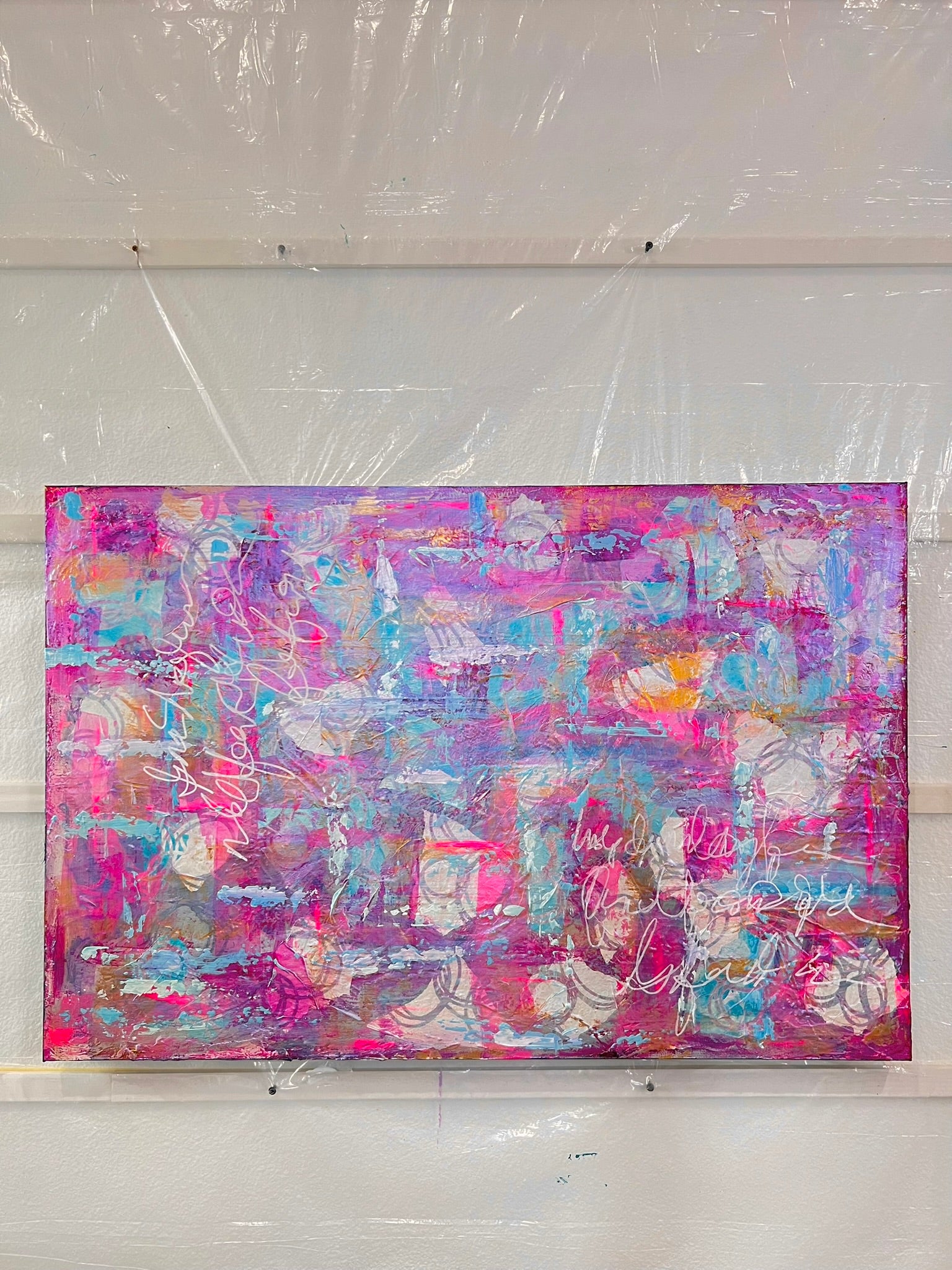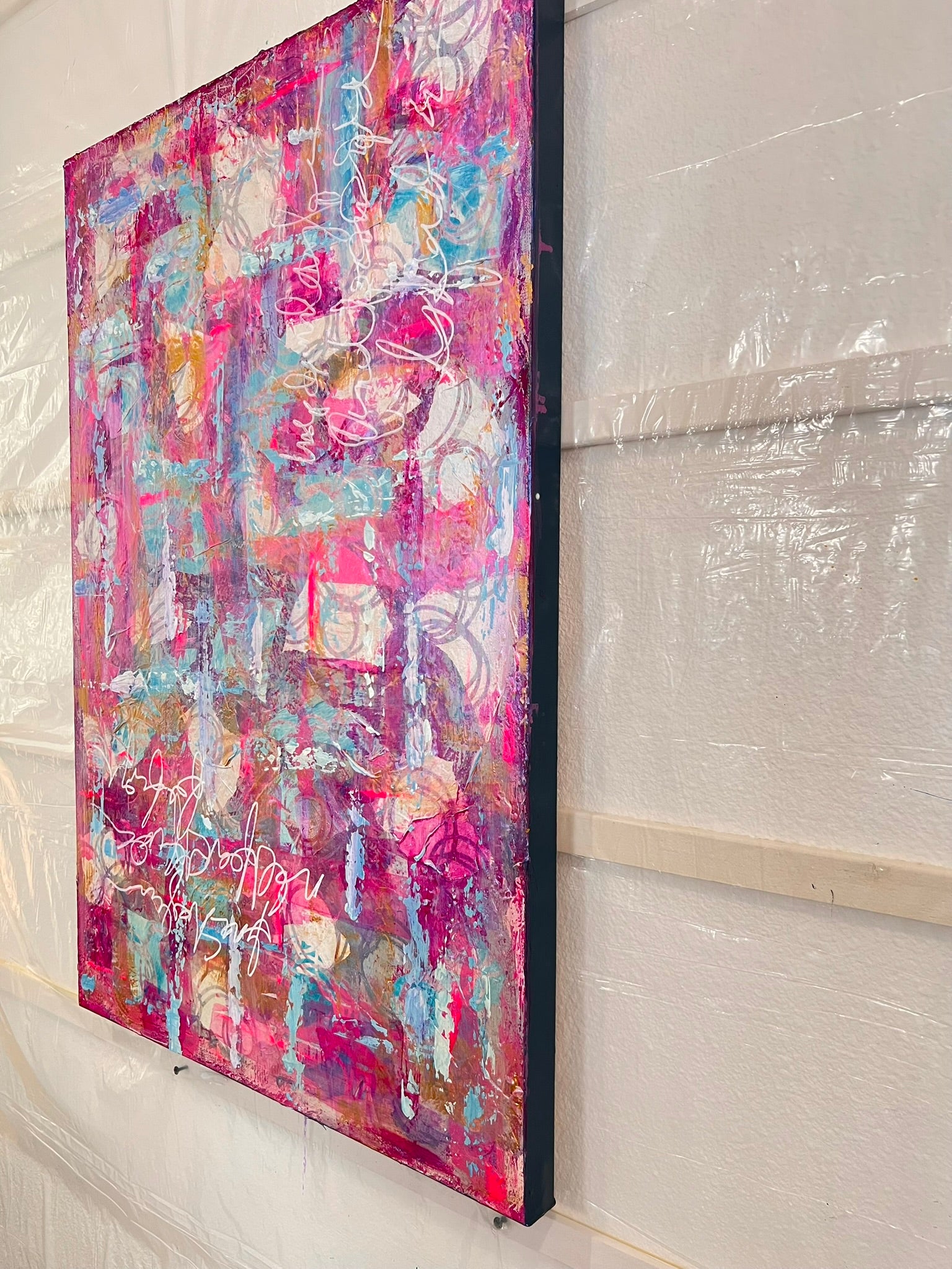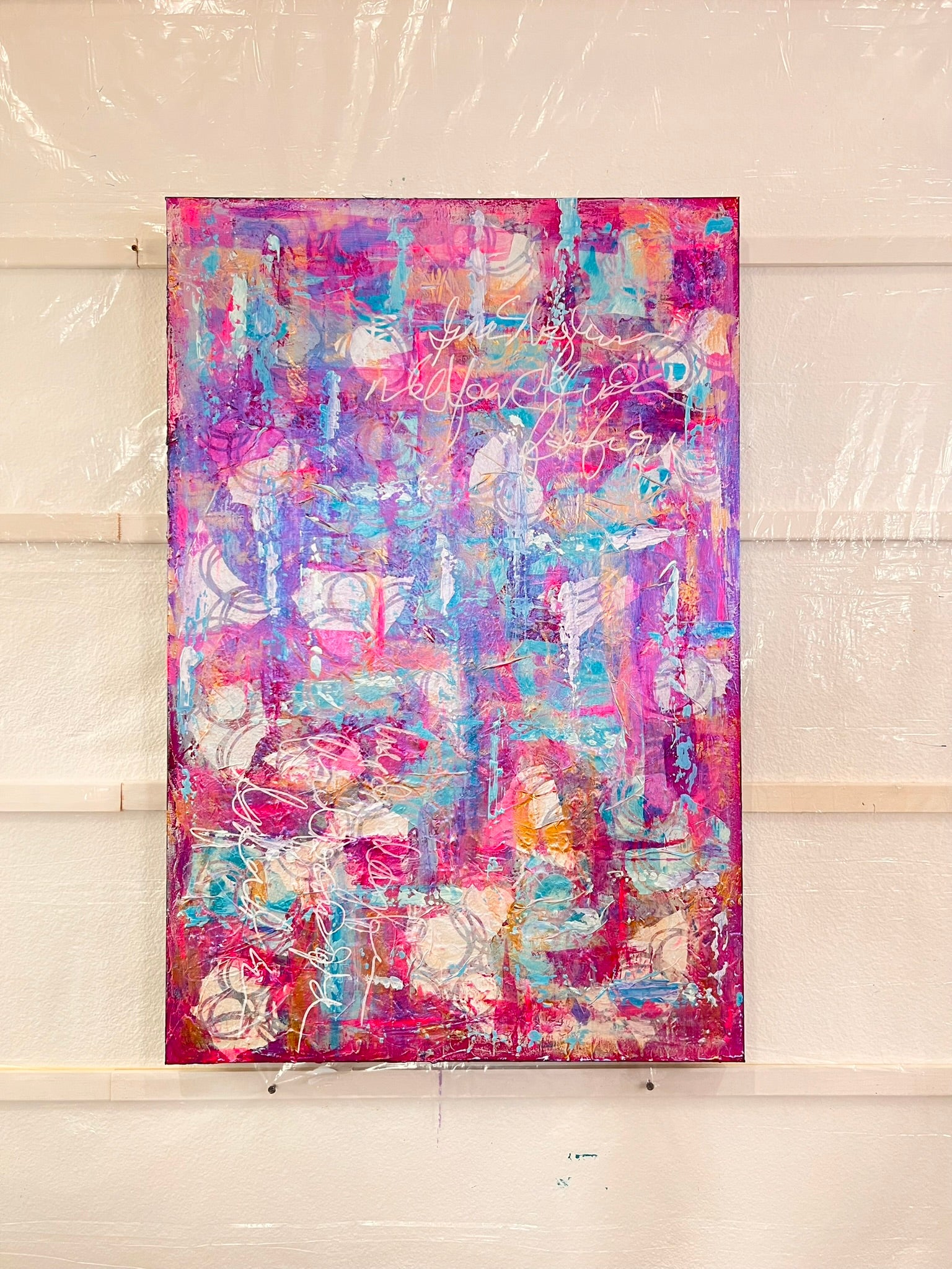 This artwork features a vibrant interplay of circles and lines, symbolizing the subtle bonds that link us despite physical distance. Its sophisticated design invites reflection on connection and separation, with secret writings, making it a thoughtful addition to any space seeking depth and meaning.